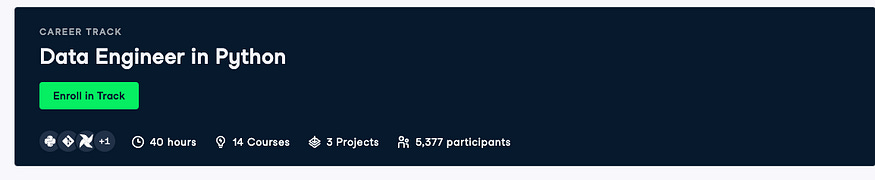 Datacamp is another great platform to learn online and embark upon the journey of becoming a Data Engineer. They offer a Data Engineer Track which takes you through Cloud Computing fundamentals, Python Programming, API versioning foundations, and orchestration with Airflow and gets you to learn via dedicated practical projects as well.