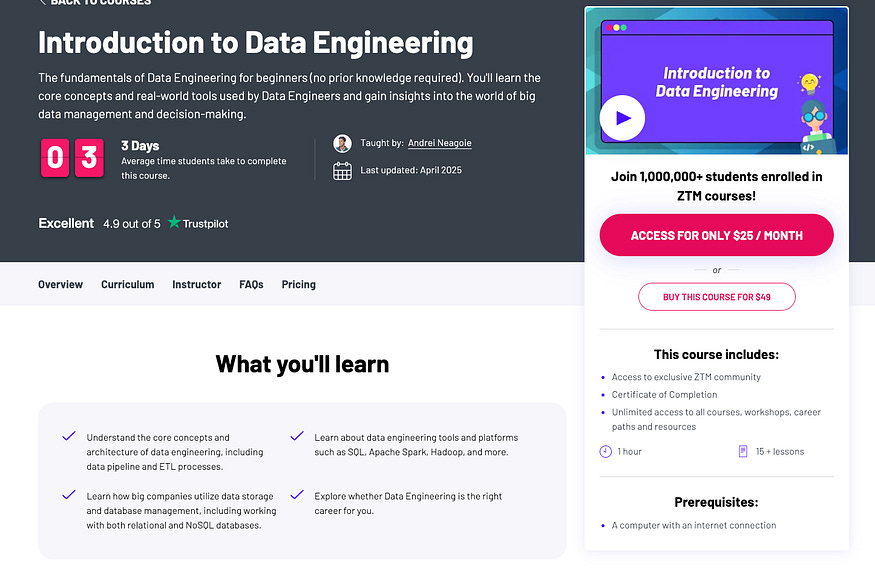 The curriculum is a 101 deep dive into the data engineering world and is a great entry point to get a high-level understanding of the topic and a course completion certificate right after 1-hour of learning.